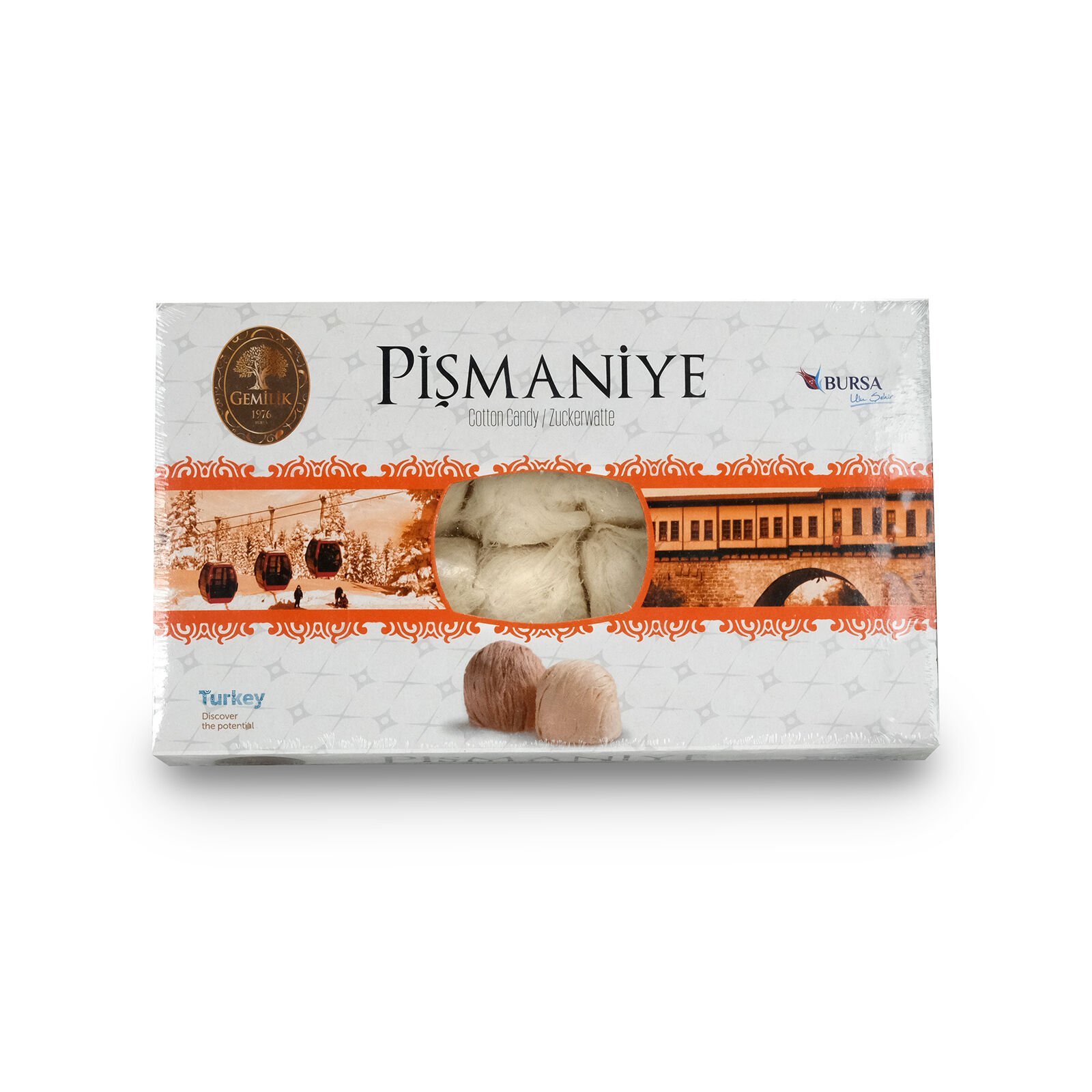 Gemilik Vanilyalı  Pişmaniye, geleneksel ustalıkla hazırlanan, ağızda eriyen pamuk gibi lifleriyle keyifli anlarınıza tat katar. Vanilya ve kakao aromalarının enfes uyumu, hem damakta hem hafızada iz bırakır. Bursa’nın kültürel dokusunu yansıtan şık büyük kutu tasarımıyla hem ikramlarınız hem de hediye seçimleriniz için mükemmel bir tercihtir. Misafir ağırlamalarında, özel günlerde veya kendinizi şımartmak istediğiniz anlarda lezzetli ve nostaljik bir deneyim sunar.