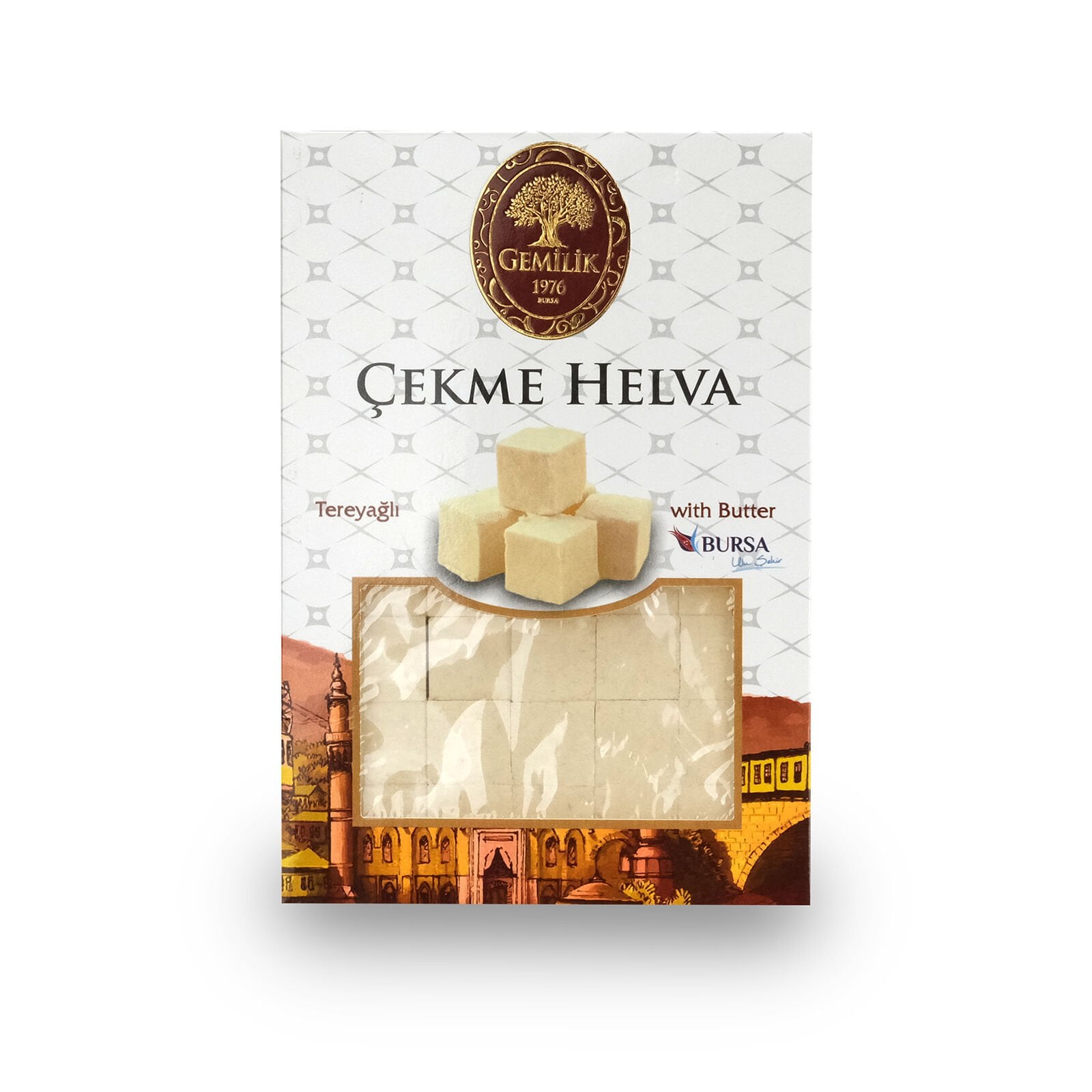 Gemilik Tereyağlı Çekme Helva – Osmanlı mirasından günümüze ulaşan bu eşsiz tatlı, doğal tereyağıyla hazırlanan yumuşacık dokusuyla damakta erir. El emeğiyle çekilerek üretilen lifli yapısı, tahin ve tereyağının uyumunu mükemmel şekilde yansıtır. Bursa’nın köklü tatlı geleneğini yaşatan bu helva, çay ve kahve saatlerinde veya misafir ikramlarında zarif bir tercihtir. Katkısız içeriğiyle doğallığını korur, sade ama unutulmaz bir lezzet sunar. Şık kutu ambalajı sayesinde özel günlerde hediye olarak da idealdir.