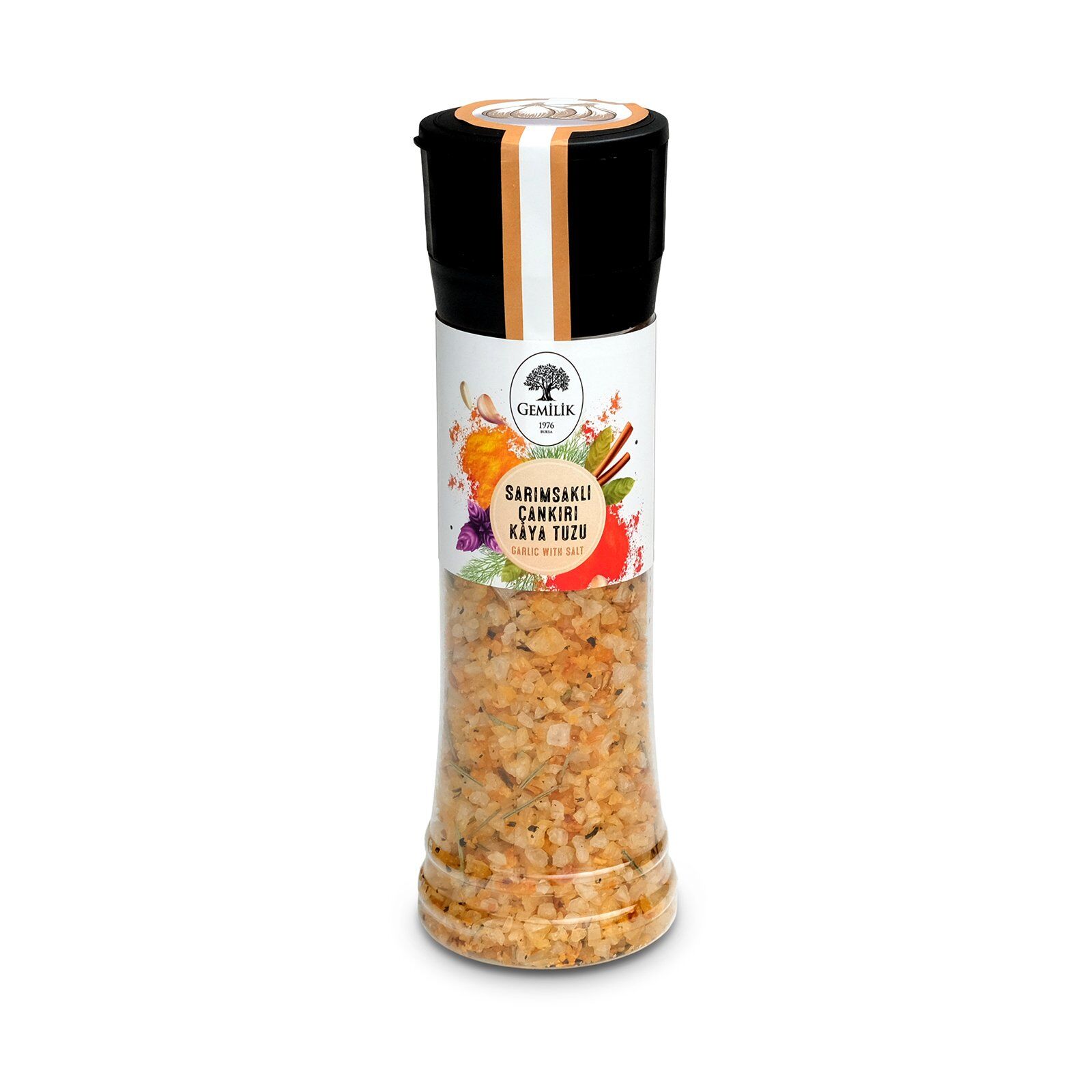 Gemilik Lokumcusu Sarımsaklı Çankırı Kaya Tuzu, yemeklerinize doğallığın en saf halini getirir. Çankırı’nın mineral açısından zengin, rafine edilmemiş kaya tuzu; kurutulmuş sarımsak parçalarıyla harmanlanarak lezzet dolu bir karışım haline getirilmiştir. Et, sebze, makarna, pizza ve salatalarda mükemmel bir aromatik dokunuş sağlar. El yapımı olarak üretilen bu özel karışım katkı, koruyucu ve rafine tuz içermez. Değirmenli ambalajıyla her öğütmede taptaze sarımsak aromasıyla sofralarınıza sağlık ve lezzet katar.