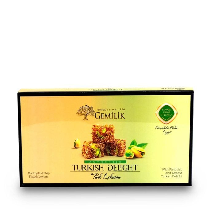 Geleneksel Osmanlı tatlı mirasının en özel yorumlarından biri olan Gemilik Kadayıflı Antep Fıstıklı Lokum, taptaze kavrulmuş kadayıf ve seçilmiş Antep fıstıklarıyla hazırlanır. Kadayıfın çıtır dokusu, fıstığın yoğun aromasıyla birleşerek lokuma eşsiz bir lezzet katar. Katkısız ve doğal malzemelerle üretilen bu lokum; özel günlerde ikramlık, kahve yanında tatlı bir eşlikçi veya sevdiklerinize hediye olarak idealdir. Her lokmada hem nostaljik hem de zengin bir tat sunar.