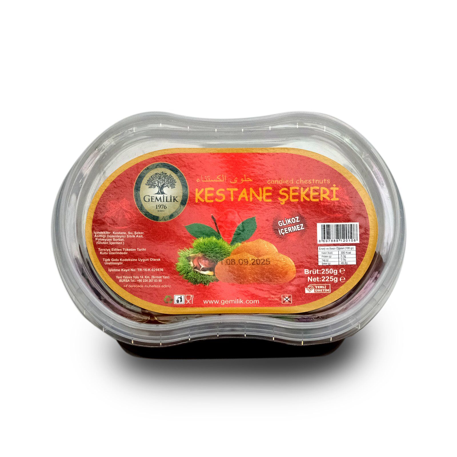 Gemilik Duble Kestane Şekeri 250 g – Bursa’nın bereketli topraklarında yetişen en kaliteli kestanelerden üretilen bu özel tatlı, geleneksel yöntemlerle hazırlanır. Glikoz içermeyen doğal formülüyle sağlıklı bir lezzet sunar. Her bir kestane, özenle pişirilip hafif şerbetle buluşturularak mükemmel yumuşaklıkta bir dokuya kavuşur. Damakta uzun süre kalan aromasıyla çay ve kahve yanında keyifli bir tatlı deneyimi sunar. Şık ambalajı sayesinde hediye olarak da zarif bir tercihtir. Gerçek Gemilik kalitesiyle üretilen bu kestane şekeri, Bursa’nın tatlı mirasını sofralarınıza taşır.